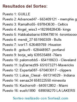 Lista de participantes: Esparta087- 670403017 - clippers, byDarnez99- 651073271-Mavericks, ivor17- 626469769 -Houston, Lukas_Clesal - 661314029 - Indiana, Angel_wiss3 +18299828436- kings, mendi_27 651960309 - Bulls, eusfc1890 689056270 LA LAKERS, Habbababarisi 699479014 -torontoooooo, senaa24 658322550 minesota, borja_wily 639535488 -76ers, Ramalho55- 697843630 - Celtics, Kachorro9 - 640512802 - Miami, palomorbb5 - 654118633 - Cleveland Cavaliers, Advanced47 - 663409121 - memphis grizzlies, .golsur9 - 628448957- portland, GUILLE.