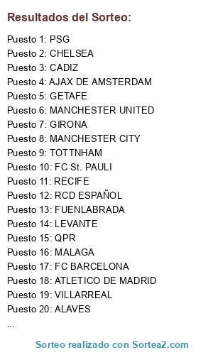 Lista de participantes: AC MILAN, AJAX DE AMSTERDAM, ALAVES, ARGENTINOS JUNIORS, ATHLETIC DE BILBAO, ATLETICO DE MADRID, BAYERN MUNICH, BORUSSIA DORTMUND, BRIGHTON, CADIZ, CELTIC, CHELSEA, FC BARCELONA, FC St. PAULI, FUENLABRADA, GETAFE, GIRONA, HUESCA, LAS PALMAS, LEEDS UNITED, LEVANTE, LIVERPOOL, MALAGA, MANCHESTER CITY, MANCHESTER UNITED, OLYMPIQUE DE LYON, OSASUNA, PSG, PSV, QPR, RCD ESPAÑOL, REAL BETIS, REAL MADRID, REAL OVIEDO, RECIFE, SABADELL, SEVILLA, TOTTNHAM, VALENCIA, VILLARREAL.