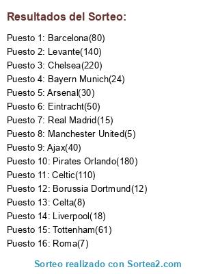Lista de participantes: Manchester United(5), Roma(7), Celta(8), Borussia Dortmund(12), Real Madrid(15), Liverpool(18), Bayern Munich(24), Arsenal(30), Ajax(40), Eintracht(50), Tottenham(61), Barcelona(80), Celtic(110), Levante(140), Pirates Orlando(180), Chelsea(220).