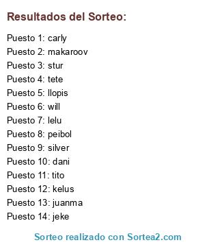 Lista de participantes: carly, kelus, tete, silver, jeke, llopis, tito, will, stur, dani, peibol, juanma, makaroov, lelu.
