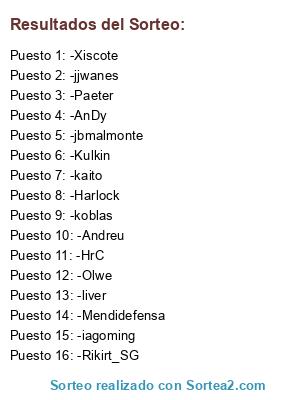 Lista de participantes: -Rikirt_SG, -Harlock, -iagoming, -liver, -Xiscote, -kaito, -HrC, -Andreu, -jbmalmonte, -AnDy, -koblas, -Kulkin, -Paeter, -Olwe, -Mendidefensa, -jjwanes.