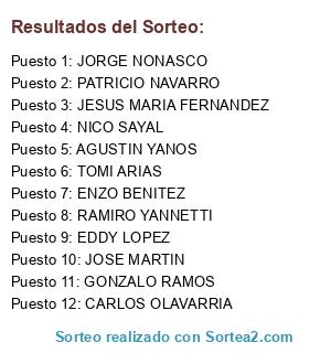 Lista de participantes: CARLOS OLAVARRIA, JORGE NONASCO, JOSE MARTIN, NICO SAYAL, EDDY LOPEZ, PATRICIO NAVARRO, AGUSTIN YANOS, RAMIRO YANNETTI, GONZALO RAMOS, TOMI ARIAS, JESUS MARIA FERNANDEZ, ENZO BENITEZ.