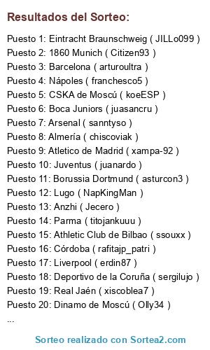 Lista de participantes: 1860 Munich ( Citizen93 ), Atletico de Madrid ( xampa-92 ), Athletic Club de Bilbao ( ssouxx ), Parma ( titojankuuu ), Deportivo de la Coruña ( sergilujo ), Spartak de Moscú ( soundofmusic10 ), Barcelona ( arturoultra ), Córdoba ( rafitajp_patri ), Nápoles ( franchesco5 ), Arsenal ( sanntyso ), Bayern Munich ( JB-recre ), Eintracht Braunschweig ( JILLo099 ), Liverpool ( erdin87 ), Hellas Verona ( SamuGalego ), Sampdoria ( nachograna2 ), Millonarios ( carliho_killer89 ), Dinamo de Moscú ( Olly34 ), Real Jaén ( xiscoblea7 ), Lugo ( NapKingMan ), Boca Juniors ( juasancru ), Juventus ( juanardo ), Anzhi ( Jecero ), Almería ( chiscoviak ), Borussia Dortmund ( asturcon3 ), CSKA de Moscú ( koeESP ), Hércules ( sanguangoo ).