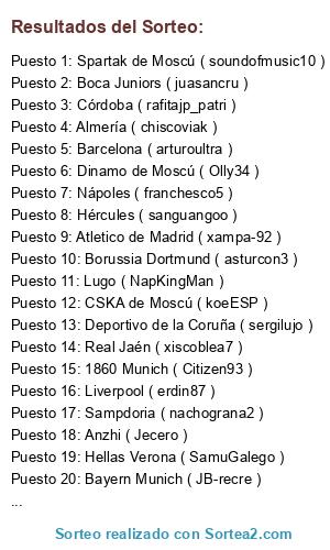 Lista de participantes: 1860 Munich ( Citizen93 ), Atletico de Madrid ( xampa-92 ), Athletic Club de Bilbao ( ssouxx ), Parma ( titojankuuu ), Deportivo de la Coruña ( sergilujo ), Spartak de Moscú ( soundofmusic10 ), Barcelona ( arturoultra ), Córdoba ( rafitajp_patri ), Nápoles ( franchesco5 ), Arsenal ( sanntyso ), Bayern Munich ( JB-recre ), Eintracht Braunschweig ( JILLo099 ), Liverpool ( erdin87 ), Hellas Verona ( SamuGalego ), Sampdoria ( nachograna2 ), Millonarios ( carliho_killer89 ), Dinamo de Moscú ( Olly34 ), Real Jaén ( xiscoblea7 ), Lugo ( NapKingMan ), Boca Juniors ( juasancru ), Juventus ( juanardo ), Anzhi ( Jecero ), Almería ( chiscoviak ), Borussia Dortmund ( asturcon3 ), CSKA de Moscú ( koeESP ), Hércules ( sanguangoo ).
