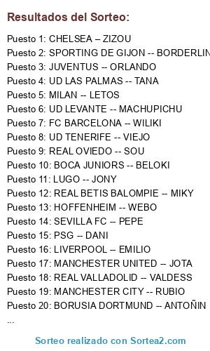Lista de participantes: UD TENERIFE -- VIEJO, JUVENTUS -- ORLANDO, SPORTING DE GIJON -- BORDERLINE, LUGO -- JONY, REAL OVIEDO -- SOU, VALENCIA - GILXO, UD LEVANTE -- MACHUPICHU, BOCA JUNIORS -- BELOKI, MANCHESTER CITY -- RUBIO, MILAN -- LETOS, HOFFENHEIM -- WEBO, UD LAS PALMAS -- TANA, FC BARCELONA -- WILIKI, PSG -- DANI, REAL VALLADOLID -- VALDESS, BORUSIA DORTMUND -- ANTOÑIN, REAL BETIS BALOMPIE -- MIKY, SEVILLA FC -- PEPE, LIVERPOOL -- EMILIO, MANCHESTER UNITED -- JOTA, INTER DE MILAN -- DANI CALLEJA, CHELSEA – ZIZOU.