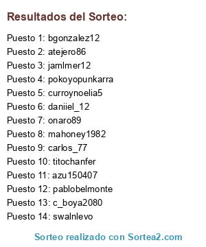 Lista de participantes: MAHONEY1982, C_BOYA2080, CURROYNOELIA5, ATEJERO86, BGONZALEZ12, AZU150407, SWANLEVO, JALMER12, PABLOBELMONTE, TITOCHANFER, ONARO89, DANIIEL_12, POKOYOPUNKARRA.