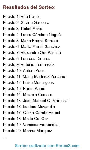 Lista de participantes: S Porras Rosal, Alexandre Ors Pascual, Gema Garate Embid, Angeles Rosa, Jesus Castro Barrera, Bruno Castro Lara, Adeli Barrera Perez, Ana Aranda, Maria Baena Serrato, Manuel Zubeldia Huidobro, Angel Manlo, Angeles Diaz Baena, Luz Divina Vega Luján, Silvina Gancera, Virginia Lopez Zaton, Paula Guillén, Nines Lapuente, Maria Angeles Diaz Peinado, Jose Manuel G. Martinez, Mai Tesoro, Angeles Ramos, Angel Romero, Pilar Gil Costa, Maria Jose Rosello, Benigna Tasende, Karim Karim, Leire Mateos Nogales, Aitana Zubeldia, Rachid Rachid Zaidin, Maria Jose Rodriguez Garcia, Maria Pilar Ortiz, Laura Martin Bejarano, Zulema Pontes Vidal, Emilio Álvarez Rodríguez, Sonia Fuentes, Maty Arma, El blog de aceber, Rosa Maria Rodriguez, Montse MaCa, Micaela Corsaro, Beatriz Mena, Isabel Teis Tarinas, Amaya Manualidades, Pascual Puri, Angeles Sánchez Sicilia, Sarah Maria Pazos, Pilar Sanchez Montañes, Alfredo Alfaro, Luisa Menargues, Amaia Torres Sánchez, Vanessa Maria, Sergio Arnaiz Delgado, Javiandsandra Villamanta, Antonio Fernandez, Isadora Mayandia, Isa García, Maria Martinez Zorzano, Esther G. Espí, Martamiguelana Beni, Lourdes Dinares, María Mgdalena Osma, Ana Bertol, Lore Ismamiriam, Mónica Prieto García, Mari Carmen Sepúlveda Pedroche, Angel Lopez, Marta Martin Sanchez, Patricia Demedice, Carmen Bonafé Ramos, Nuria Gomez Lirio, Vanessa Fernandez, Rocio Garcia, Mónica Pico, Laura Gándara Nogués, Susana Isabel S, Maite Gal Gar, Luisa Maria Garcia Repiso, Susimari R de Garcia, Berta Rius, Sandra Sanes, Antoni Pous, Rakel Maria, Beatriz Álvarez Lomba, Laura Gamis, Joaquin Nito De, Marina Marquez.