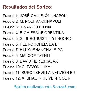 Lista de participantes: S. BERGHUIS FEYENOORD, X. SHAQIRI LIVERPOOL R, M. POLITANO NAPOLI, HULK SHANGHAI SIPG, DAVID NERES AJAX, F. CHIESA FIORENTINA, SUSO SEVILLA NERVIÓN BR, MALCOM ZENIT, J. SANCHO Libre, JOSÉ CALLEJÓN NAPOLI, C. PAVÓN Libre, PEDRO CHELSEA B.