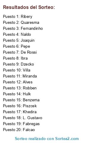 Lista de participantes: Robben, Ribery, Naldo, Fernandinho, Dzecko, Khedira, Quaresma, L. Gustavo, De Rossi, Alves, Joaquin, Villa, Miranda, Falcao, Pepe, Ibra, Hulk, Piszcek, Benzema, Fabregas.