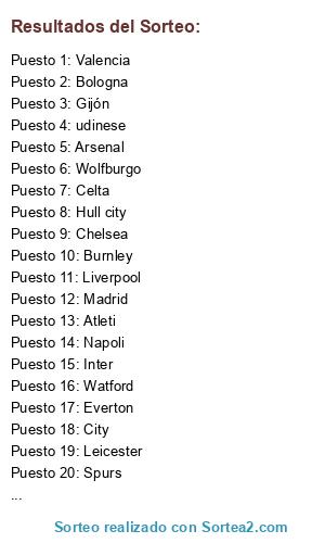 Lista de participantes: Madrid, Arsenal, Wolfburgo, Leganes, sampdoria, Dormund, Bologna, Burnley, Bournemouth, Sassuolo, Napoli, Spurs, Inter, Valencia, Celta, City, Osasuna, Everton, Watford, Chelsea, Sevilla, Liverpool, Real sociedad, betis, Leicester, Milan, udinese, Bilbao, Gijón, Hull city, Villareal, Atleti.