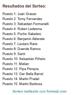 Lista de participantes: Benjamin Alderete, Lautaro Raris, Pocho Sabalero, Santi, Ger Bella Barral, Duende Ramos, Ruben Ledesma, Melian, Tomy Fernandez, Martin Barbosa, Sebastian Fermanelli, Pipa Pereyra, Sebastian Piñeiro, Martin Pradal, Juan Grasso.