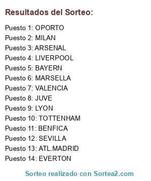 Lista de participantes: BAYERN, LYON, SEVILLA, VALENCIA, ATL.MADRID, MARSELLA, OPORTO, JUVE, BENFICA, EVERTON, LIVERPOOL, ARSENAL, TOTTENHAM, MILAN.