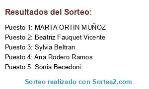 Lista de participantes: M Jose Pando, Laura Lozano Sánchez, reyes gomez, Olga Peñalver, gema moset, angela sanchez-paus, Julia Carrasco, ROSA morcillo fernandez, Adela grande, Leire Zapatero Ichaso, martin martinez porcel, ROBERTO SAEZ CHAMIZO, María Dolores Gomez, Esther García, belen queiruga, Silvia Arribas, Rosa Isa Calonge López, Juana Martinez Moreno, Isabel Gómez García, ana maria Exposito Rodriguez, noemi Andrés, soraya Diaz, Raquel Iglesias Moreira, Macarena montes, Belen alzar, Virginia De Castro Sánchez, Victoria Sanchez Giménez, Isabel Rico Marta, Rosalina Martín Márquez, Alicia mayoral Lacoma, Yaiza Izquierdo Milán, Ascensión Sanchez Cabezas, Cristina Mourisco, cristina gonzalez, ana belén martinez, Manuel Tornel Martínez, Sonia Cañadas, Raùl Duràn Page, Mª Jose Carballo, Sonia Blanco, gema Maldonado, sol carballo, Esperanza Castillo, sonia cervello, amaya Fernández polo, Yenny Reyes, Beatriz Calle, mildred janixia fuentes, Rosa Pinedo Gonzalez, Noelia Lopez García, Cristhy fitas, lourdes Sanchez garrido, Rebeca Salgado Rendo, judith rodriguez, MARIA PILAR GABIAN IGLESIAS, gema reyes, Irene Aren Garcia, maria isabel. Rosa Gragera, Montse Cristóbal, Mariola Martínez Martinez, marta campos gomez, marta lopez, Vanessa Arrizabalaga, Gema manzano frenandez, Raquel hernando campos, rocio de manuel, estefania jarabo, Mar Cuesta Morales, david luis, yolanda suarez, Leticia San Jose, Gema Lopesino Sánchez - Rey, Laura Rubin, Ana Rodero Ramos, ana isabel alguacil, Noelia Carboneros Martin, Tamara Jiménez, Alba Moreno, Marta samtalla lastra, sara Lara palmero, Naiara Fole, Ana Maria Lazaro Mena, Mari Carmen Rodrigo monrabal, Ángel Cámara, Noelia Lastra Palomera, Rafael Martínez Gómez, Estitxu Espin zalacain, Mercedes Vargas, concepcion garcia quintans, Veronica de la Cruz, maria jesus reguera, maria jesus torres camacho, MARIOLA CLIMENT, Elena Díaz, Veronica Loureiro Campos, José Ignacio Matarranz Gómez, mayra Hinojosa Falconi, Agurtzane Saenz Alonso, Myriam Burgos, Eva Perez Gonzalez, araceli roldán pérez, Soledad Vidal Fernández, ADELA FLORES GALLEGO, AIMAR GARCIA SANTAMARÍA, Belen rodriguez Serrano, Sandra Pérez, MARTA CARRETERO GARCIA, Loli Garcia largo, Toñi Meléndez Mera, Mercedes Panadero, mari carmen moron, iratxe valiño, vega ruano maestre, Amaya Santos, sanda conde freire, Irene Cid Clarós, Montserrat Fernandez Ropero, Ana Guzmán, Ana Rilo, Quina Alba Ramirez, maría angeles Elvira romero, María Muñoz Tinoco, Raquel Martín, soledad sanchez, Angela García Cifuentes, Carmen López Lozano, BERTA SEBASTIAN SENIN, Marta Muñoz, Elena De La Calva, María Morin, Maria José García Alpañez, paqui molina, Gema Fuertes, María Jesús Minsut Chacón, yolanda ramirez, sara de la granja, Vanesa Méndez, carmen chamorro torres, ana hernandez ruiz, María Sánchez, silvia gonzalez, Montse Presas, Almudena Pino Varela, Olga Martinez, Estefanía Reyes, M.Angeles Tornell, Montse Moreno Santamaría, Raquel Martinez, montserrat balmaseda murillo, Angel Garcia Lopez, Judith Mani Guitart, clara garcia, María Victoria Valeros Blázquez, MANOLI VALVERDE RIVAS, Beatriz de la Rosa Castro, Vicky Rodríguez, blanca urcelay, María Jesús Rodríguez, M Euge mia Alonso alvarez, Judit Abia Díaz, Mayte Puerto Álvarez, Estefania Lozano, elena gallego, ANNA PEIDRO PEINADO, Vanesa Fernandez Seco, Miryam Vela, sonia JUEZ acosta, Ana Arnáiz, Carolina Mendieta, giovanna giovanna, Natalia Rubinat, sarah garcia srlp, eva maria fernandez arias, Charo Palma, Victoria Hernández Riquelme, MARTA ORTIN MUÑOZ, Ana Maria Cañaveras Rios, alicia collado, MARIA JOSE BORREGO SANZ, eva maria camino, Monica Lastra cantabria, Reyes Conde, Marian P C Puente Campillo, Nicolás Iglesias Gutiérrez, Silvia Manzano Casado, Marina Rosinach Triquell, Judith Ramon Arcoiza, Ana Gonzalez Pereira, M Carmen González Lora, laura granado ruiz, Ana Maria Arrarás del Haya, Estela Díaz Canteli, Beatriz Nogueira Gonzalez, Ana horras, carmina carmina, vanessa varela iglesias, carmen martinrz, maria victoria salvador muñoz, Almudena Ibáñez, concepción Ibáñez Albiach, Virginia Lozano, lolita leon, patricia gomez, Mónica Briongos, EMILIA PAREJO GALA, Manuela Parejo Gala, Rosa cantero, Ana Villaverde Barcenilla, delia campian, Gema Mostaza, Aranzazu Muelas, victoria gonzalez de haro, Sara Menor Gonzalez, laura ros puertas, Raquel Gordillo, Ainhoa Yudego, Mónica Flores, Manuela Soria, ana fernandez, Eugenia Miranda García, Nuria Perez Ortega, Beatriz Herranz, Eva Fernández, María María Albuja, sonia hinojosa, agustin mejias portilla, Beatriz Ruiz, Carlos Daniel Muñoz Diaz, bibiana losada Conde, María Inmaculada garcia, Rosario Soto Orozco, Begoña Fernández, Cristina godino, Susana richards fernandeZ, Marta Cosin Martínez, Yolanda sanchez, Sergio Balboa, esther molinos roncal, Silvia Erika Chuc Hinostroza, CRISTINA BEJERANO, Mónica Rodríguez Gómez, ALEJANDRO JASPE RODRIGUEZ, MARIA MARTINEZ ZORZANO, Loli Docampo, keles ponsa, Nury Blanco Bocachica, maria eugenia dominguez tielas, Susana Gomez Estevez, Rocío Rocío Martinez, patrIcia rodriguez, Puri Almazan Ortega, isabel ortiz, Eva Rodriguez, María José Rechi Gutiérrez, Patricia Mencias, Nuria Piñón, gemacontre gema contreras, ALEXIA SANTOS, Carolina Hernández, marisa lomas, Elena Martínez, isabel guillen melero, Miriam Monsalve, maria esther López cotelo, Vanesa Losa, Sofía Varela, Mar Guerrero, ISABEL RODRIGO MIQUEL, Begoña Gutiérrez, Isabel Isabel, Gemma Borrallo, mari luz contreras, María Sánchez García, Montserrat Lopez, Casimira Espejo, Ana Placer, amaya garcia garcia, Adam Abrevaya lorch, fco javier ponce garcía, arancha Jimenez racero, Sonia Redruello, marta prado alonso, Jaqueline Nekyha, alicia alicia muñiz, Amaya Martínez Agüero Amaya Martínez Agüero, LIDIA LUENGO, Mónica De Paz García, isabel porcel, RUFINA LAJARA BELANDO, Aroa Orihuela Vega, olga cobaleda cobos, MªAngeles Polo Corell, karina