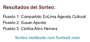 Lista de participantes: Carlos Alberto Miranda García, María Elena García Zevallos, Carlos Alberto Miranda Lopez, Isabel Caro, Danilo Jimenez, Ysabel Ventura, Paula Garrido, Maggie Hrz, Cinthia Atiro Herrera, Mercedes Delgado Jara, Luisa Miranda, Luz Mercedes Palus Gaviria, Dennis Arturo Alcántara Diaz, Sylvia Gabriela Tang Unzueta, Oscar Pacherres, Victor Eduardo Villafuerte Robles, Compartido EnLima Agenda Cultural, Susan Aponte, Sandra Moreto Bustamante, Willie Palacios, Aldo Beraun Torres, Fernando Yonathan Bustamante Mattos, Chio Espinoza Olcay, Angel Zevallos, Zemira Oscanoa, Zelmira Pinazzo, Angela Espinoza, María Mamani Copertino, Melvin Vale Chic, Sheyla Sabrina C A, César Guerrero, Haranpa Jorudan, Leidy Pacheco Córdova, DannaCristina GC, Elio Guerrero Torres, Rossmery Pintado Gómez, Romulo Remo Mansilla Balboa, Anthuanet Benavides Guardia, Samira Riquelme Vasquez, Solymar Bautista Pillaca, Alexander C. Mendez, Diana Flor Ángeles Arias, Pamela L. Olivera Thompson, Yadira Luy Hidalgo, Ana Sofia Castellanos, Julio Chavesta, Silvia Perea, Leydi Ordoñez Inga, Karla Olivera Galdos, Xana Martínez, Maurizzio López Puga, Carmen Rocío Herrera Vargas, Melanie Rojas, Sonqorita Martinez, Linda Patricia, Mariluz Fatima, Carlo Escalante León, Cesia Lescano.