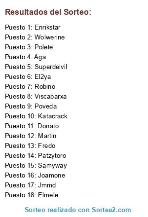 Lista de participantes: Poveda, Samyway, Fredo, Elmele, Donato, El2ya, Aga, Superdeivil, Katacrack, Jmmd, Viscabarxa, Robino, Enrikstar, Joamone, Polete, Martin, Patzytoro, Wolwerine.