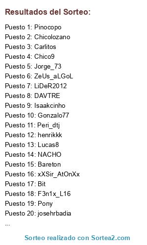 Lista de participantes: Bareton, Chico9, Lucas8, Jorge_73, josehrbadia, Albert2, alexpr99, Pony, Pinocopo, LiDeR2012, Carlitos, Bit, NACHO, ZeUs_aLGoL, Brasii, F3n1x_L16, Isaakcinho, Peri_dtj, henrikkk, Chicolozano, xXSir_AtOnXx, DAVTRE, TheVicBoSS, Gonzalo77.