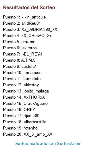 Lista de participantes: XX_3l_amo_XX, kikin_anticule, I-EL_REY-I, jomaguso, castefa1, akiestoy, gerapro, albertcastillo, XxTHORxX, javitoros, xX_CResPO_Xx, rotenho, CrackAgüero, tamudator, OREY, A.T.M.9, josito_malaga, djama80, aNdReu01, Xx_09BRIAN90_xX.