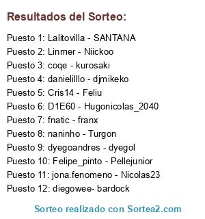 Lista de participantes: Linmer - Niickoo, D1E60 - Hugonicolas_2040, dyegoandres - dyegol, Felipe_pinto - Pellejunior, Lalitovilla - SANTANA, danielilllo - djmikeko, diegowee- bardock, jona.fenomeno - Nicolas23, fnatic - franx, Cris14 - Feliu, coqe - kurosaki, naninho - Turgon.