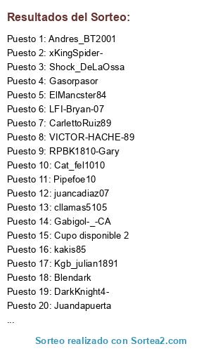 Lista de participantes: JhonFaro, RPBK1810-Gary, CarlosTovarO21, Milzu25, Camrodm, xKingSpider-, Blendark, ElComedian84, ElMancster84, Cat_fel1010, Errikaldo, cllamas5105, Jonpix, Kgb_julian1891, RPBK1810-Jota, Pantrorion, iSanti-4, Apolofer1, Pipefoe10, kakis85, VICTOR-HACHE-89, ziigiik, Jona4283, Halien_villa, DarkKnight4-, jonath1032, Gabigol-_-CA, Gomezreal23, Andres_BT2001, Severoclain1, LFI-Bryan-07, Gasorpasor, Ghostbananin1, juancadiaz07, Shock_DeLaOssa, Juandapuerta, CarlettoRuiz89, CRodriguez328, Cupo disponible 2, Cupo disponible 3.