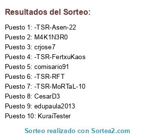 Lista de participantes: -TSR-MoRTaL-10, -TSR-Asen-22, -TSR-RFT, -TSR-FertxuKaos, M4K1N3R0, edupaula2013, crjose7, KuraiTester, CesarD3, comisario91.
