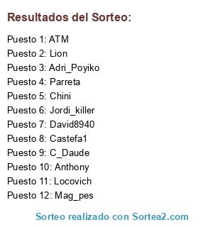 Lista de participantes: Lion, C_Daude, Jordi_killer, Parreta, Mag_pes, Castefa1, Anthony, ATM, Adri_Poyiko, David8940, Chini, Locovich.