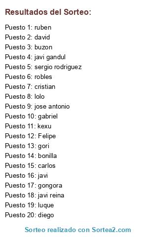Lista de participantes: gabriel, javi reina, robles, javi gandul, lolo, javi, jose antonio, carlos, diego, kexu, gori, cristian, bonilla, david, gongora, luque, buzon, ruben, sergio rodriguez, Felipe.