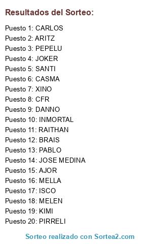 Lista de participantes: DAVID5489, CRISAOR, MARVL03, HECTORMENDOZA, SHEVAOSCAR7, XALOSKI, NORTHERNALBERTO, JAAIIMEE, PABLOVERGUERO.