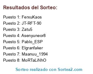 Lista de participantes: JT-RFT-90, MoRTaLiNhO, Asenyuneor8, Zatu5, Elgranfaker, Maanuu_1994, Pablo_ESP, FerxuKaos.