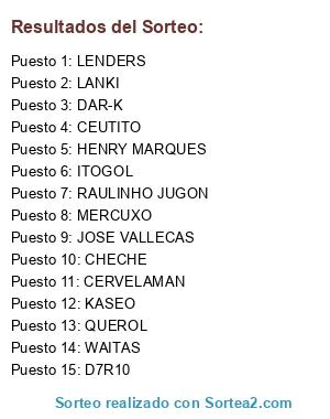 Lista de participantes: RAULINHO JUGON, KASEO, WAITAS, JOSE VALLECAS, CERVELAMAN, MERCUXO, LENDERS, HENRY MARQUES, CEUTITO, D7R10, CHECHE, QUEROL, LANKI, ITOGOL, DAR-K.