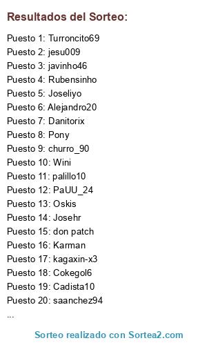 Lista de participantes: kagaxin-x3, don patch, Joseliyo, saanchez94, jesu009, churro_90, Nacho, Cokegol6, Josehr, Alejandro20, Turroncito69, eL_VyD, Peperecre, Karman, Pipo, Cadista10, PaUU_24, Danitorix, Pony, Ivann_7, Prietinho, Chustamante, javinho46, palillo10, eR_maRa, Pumuky, Xipi, Wini, Rubensinho, Meida, Oskis, Cremades_90.