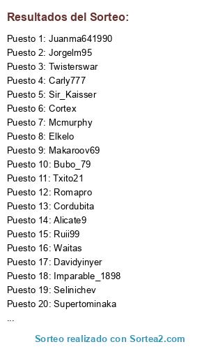 Lista de participantes: Selinichev, Sir_Kaisser, Ruii99, Cordubita, Carly777, Romapro, Cheche19, Angelete_7, Alicate9, Twisterswar, Davidyinyer, Txito21, Roqueluis, Luis22, Waitas, Supertominaka, Mcmurphy, Makaroov69, Imparable_1898, Elkelo, Amortee, Ceutito, Jorgelm95, Pedrin2106, Sheriffchenko, Cortex, Juanmiole, Bubo_79, Kinglosada, Juanma641990, Bogarde9, Falko.