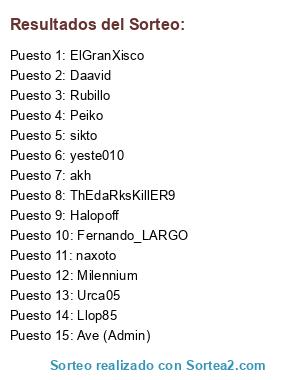 Lista de participantes: Ave (Admin), Milennium, ElGranXisco, Llop85, Fernando_LARGO, akh, yeste010, Peiko, Halopoff, naxoto, sikto, Urca05, ThEdaRksKillER9, Daavid, Rubillo.
