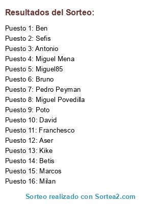 Lista de participantes: Miguel85, Marcos, Antonio, Aser, Betis, Bruno, David, Franchesco, Sefis, Kike, Miguel Mena, Milan, Pedro Peyman, Poto, Miguel Povedilla, Ben.
