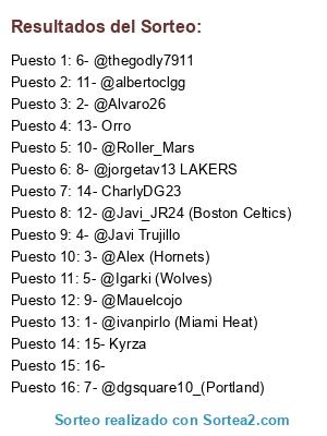 Lista de participantes: 1- @ivanpirlo (Miami Heat), 2- @Alvaro26, 3- @Alex (Hornets), 4- @Javi Trujillo, 5- @Igarki (Wolves), 6- @thegodly7911, 7- @dgsquare10_(Portland), 8- @jorgetav13 LAKERS, 9- @Mauelcojo, 10- @Roller_Mars, 11- @albertoclgg, 12- @Javi_JR24 (Boston Celtics), 13- Orro, 14- CharlyDG23, 15- Kyrza, 16- Plaza libre para inscribir.