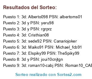 Lista de participantes: 3d: Alberto098 PSN: albertoms01, 3d y PSN: yeru98, 3d: Cristhian08, 3d: sede92 PSN: Canariojoker, 3d: Maiko91 PSN: Michael_fcb91, 3d: Elspiky99 PSN: TheSpiky99, 3d y PSN: joui10cnjtgn, 3d: roman10-cabj PSN: Roman10_CABJ, 3d y PSN: rgrprz.
