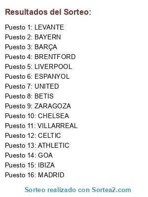 Lista de participantes: CHELSEA, VILLARREAL, LEVANTE, UNITED, GOA, BAYERN, BARÇA, MADRID, LIVERPOOL, CELTIC, BRENTFORD, ESPANYOL, IBIZA, ZARAGOZA, ATHLETIC, BETIS.