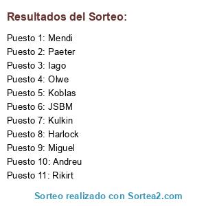 Lista de participantes: Koblas, Mendi, Olwe, Paeter, JSBM, Miguel, Harlock, Andreu, Rikirt, Iago, Kulkin.
