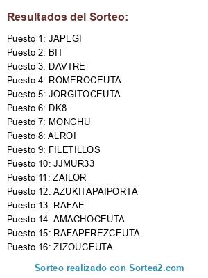 Lista de participantes: FILETILLOS, JORGITOCEUTA, JAPEGI, RAFAPEREZCEUTA, DAVTRE, BIT, DK8, RAFAE, MONCHU, ZIZOUCEUTA, JJMUR33, ZAILOR, AZUKITAPAIPORTA, ROMEROCEUTA, ALROI, AMACHOCEUTA.