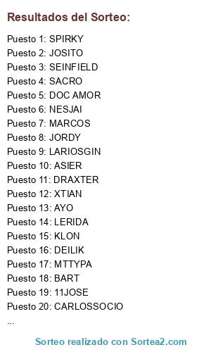 Lista de participantes: LERIDA, AYO, MTTYPA, JOSITO, ASIER, MARCOS, CARLOSSOCIO, NESJAI, BART, XTIAN, SACRO, JORDY, DOC AMOR, SEINFIELD, LARIOSGIN, ROBMEN, DRAXTER, KLON, DEILIK, SPIRKY, 11JOSE, GABITO.