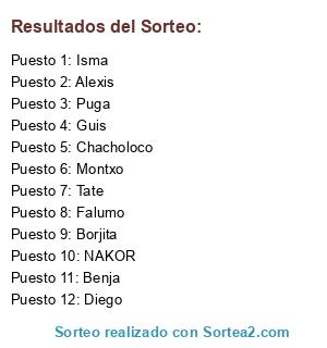 Lista de participantes: Chacholoco, Tate, Benja, Montxo, Isma, NAKOR, Guis, Borjita, Alexis, Puga, Falumo, Diego.