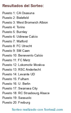 Lista de participantes: Freiburg, Burnley, RSC Anderlecht, Fulham, U. Berlin, FC Utrecht, Udinese Calcio, Swansea City, FC Metz, Bielefeld, Lokomotiv Moskva, CA Osasuna, SM Caen, RC Strasbourg Alsace, Watford, Benevento Calcio, Levante UD, Sassuolo, Torino, West Bromwich Albion.