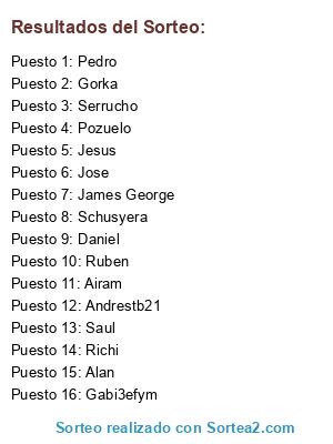 Lista de participantes: Airam, Pedro, Alan, Andrestb21, Gabi3efym, Gorka, James George, Richi, Ruben, Saul, Schusyera, Serrucho, Daniel, Pozuelo, Jesus, Jose.