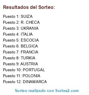 Lista de participantes: SUIZA, AUSTRIA, ESCOCIA, ITALIA, FRANCIA, UKRANIA, R. CHECA, BELGICA, DINAMARCA, PORTUGAL, TURKIA, POLONIA.