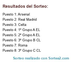 Lista de participantes: Arsenal, Real Madrid, 1º Grupo A EL, 2º Grupo A EL, Celta, 3º Grupo B CL, 3º Grupo C CL, Roma.
