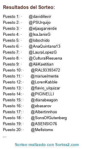 Lista de participantes: · @afdz70, · @AgVlb, · @akejammontes, · @Albertinnhoo, · @AlbertoGEnri, · @alejandra151923, · @AliiKaetitian, · @AnaQuintana13, · @annacat1973, · @AnnitaCecilia, · @ASENSIO76, · @belenfeduchi, · @blogbcnmola, · @Bretonaa, · @celos_mar, · @Claudiagnziz, · @Cmilafrancisca, · @csherlockwatson, · @CulturalResuena, · @davidillevir, · @dianabeagon, · @ebasarov, · @EdGuda, · @eljaugarverde, · @etinEspartaego, · @Feer_delangel, · @flavio_ulquizar, · @FreeganBCN, · @garvas77, · @GonzaloGlobato, · @havbcn, · @IsaacCarbajal5, · @IsaJanisG, · @joseasorolla, · @JuananJuarez, · @Lauracalc, · @LauraFontdeA, · @LauraLopezG, · @lawolemba, · @lobochido, · @LorenKabble, · @manuelmente, · @marielladelrieg, · @martaflorrick, · @Meexe, · @Mefistomx, · @moreales_mire, · @mpilar11, · @Perranorexica, · @PICINELLI, · @PSUrquijo, · @RafaelSolsOrtiz, · @RAL93393472, · @schranzyyy, · @shery_arlekin, · @SonsOfGutenberg, · @UnCafeYUnLibro.