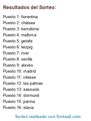 Lista de participantes: getafe, slavia, parma, river, las palmas, fiorentina, dormund, madrid, chelsea, leizpig, sassuolo, vitesse, sevilla, mallorca, barcelona, alaves.