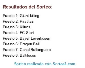 Lista de participantes: Bayer Leverkusen, Kiltros, FC Start, Dragon Ball, Baltilocos, Canal Bullanguero, Giant killing, Piratitas.