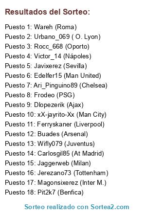 Lista de participantes: Carlosgil85 (At Madrid), Javixerez (Sevilla), Victor_14 (Nápoles), Ari_Pinguino89 (Chelsea), Wifly079 (Juventus), Ferryskaner (Liverpool), Magonsixerez (Inter M.), Jaggerweb (Milan), Rocc_668 (Oporto), xX-jayrito-Xx (Man City), Frodeo (PSG), Buades (Arsenal), Jerezano73 (Tottenham), Dlopezerik (Ajax), Pit2k7 (Benfica), Urbano_069 ( O. Lyon), Edelfer15 (Man United), Wareh (Roma).
