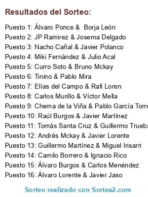 Lista de participantes: Guillermo Martínez & Miguel Irisarri, Curro Soto & Bruno Mckay, Nacho Cañal & Javier Polanco, Álvaro Ponce & Borja León, Tomás Santa Cruz & Guillermo Trueba, Elías del Campo & Rafi Loren, Álvaro Lorente & Javier Jaso, Andrés Mckay & Javier Lorente, Carlos Murillo & Víctor Mella, Camilo Borrero & Ignacio Rico, JP Ramirez & Josema Delgado, Álvaro Burgos & Carlos Menéndez, Chema de la Viña & Pablo García Torrent, Miki Fernández & Julio Acal, Tinino & Pablo Mira, Raúl Burgos & Javier Martínez.