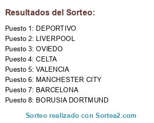 Lista de participantes: BARCELONA, CELTA, LIVERPOOL, MANCHESTER CITY, BORUSIA DORTMUND, OVIEDO, VALENCIA, DEPORTIVO.